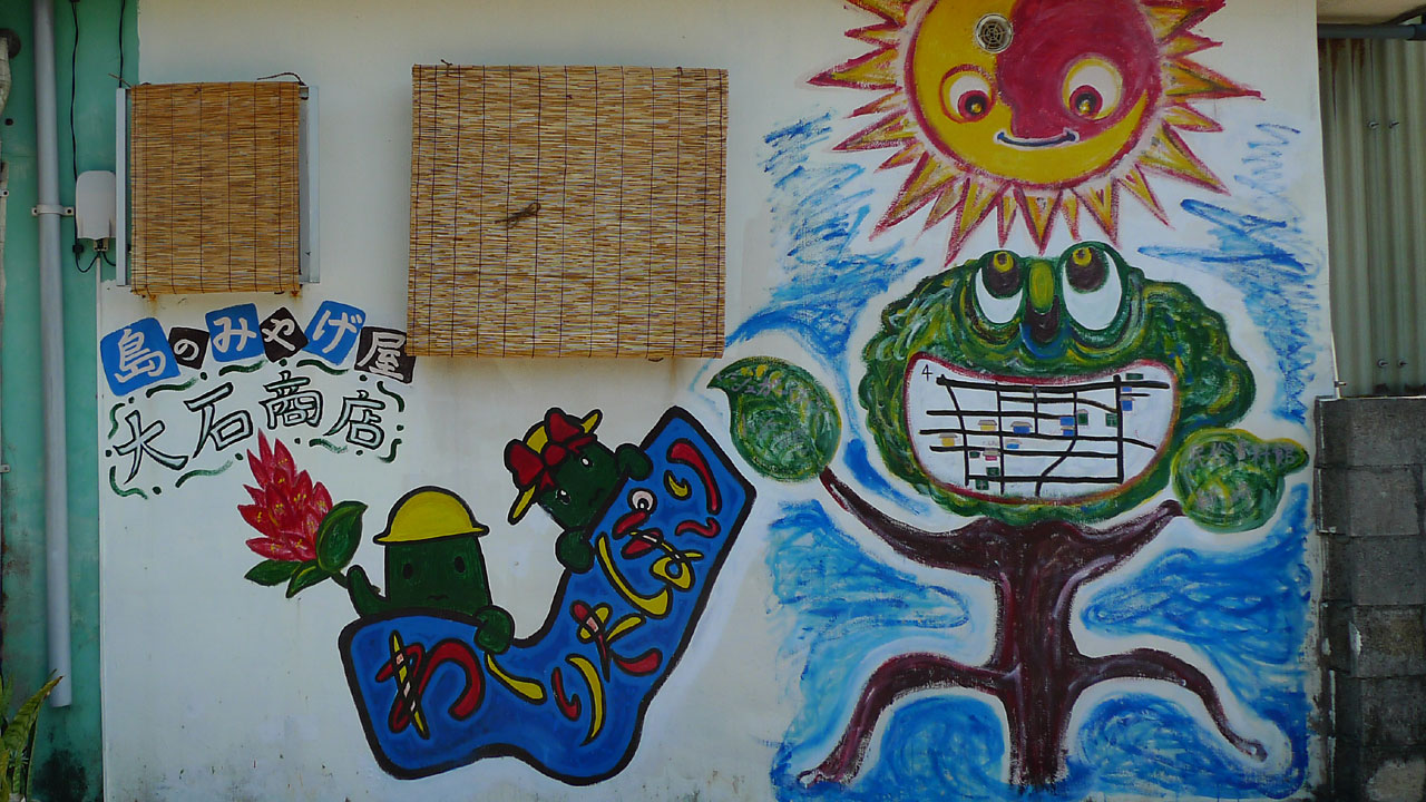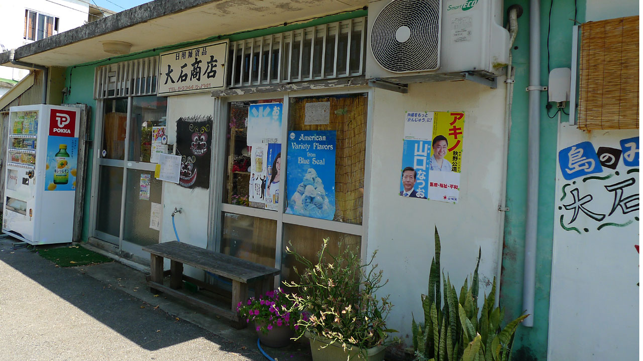 「ごーやーマン」グッズなど、おみやげが置いてあるという「大石商店」を