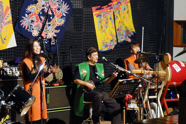 ホテルにチェックインして、ライブを聴かせてくれる郷土料理屋「ゆうな」で夕食。
