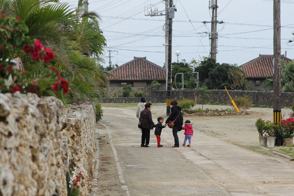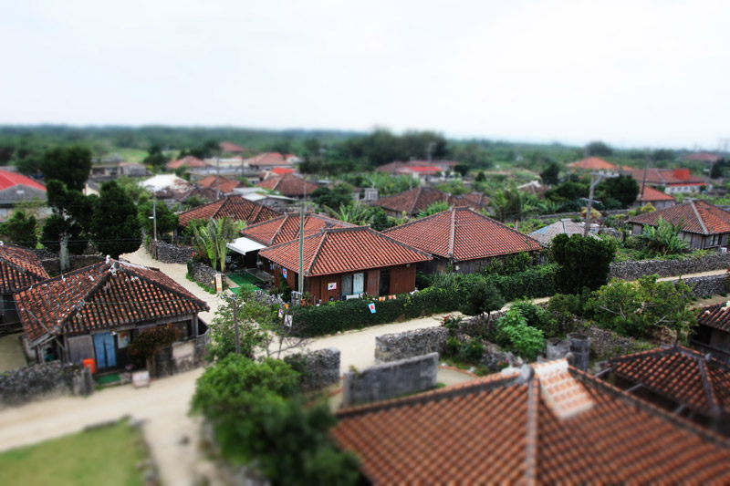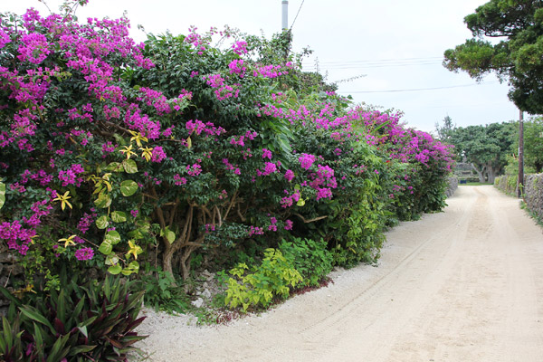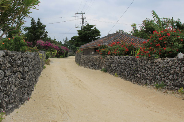 この島は、赤瓦の屋根に珊瑚の石垣と、珊瑚を砕いた砂利道など、