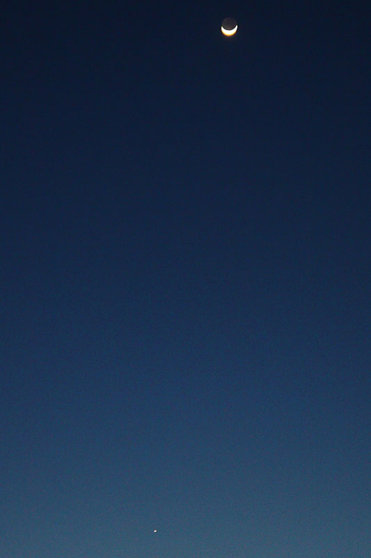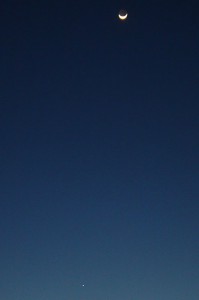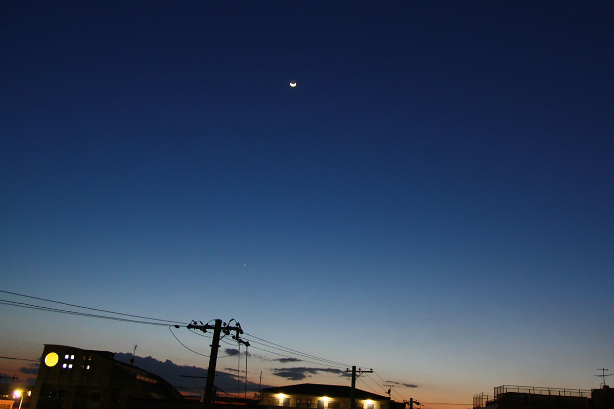 夕方、ほぼ暮れかけた空を見上げると、雲一つ無い空に、きれいな三日月と星(これは金星?)が見えました。