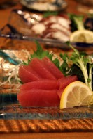 本日のおすすめの、近海マグロの刺身と、奥は島だこの造り