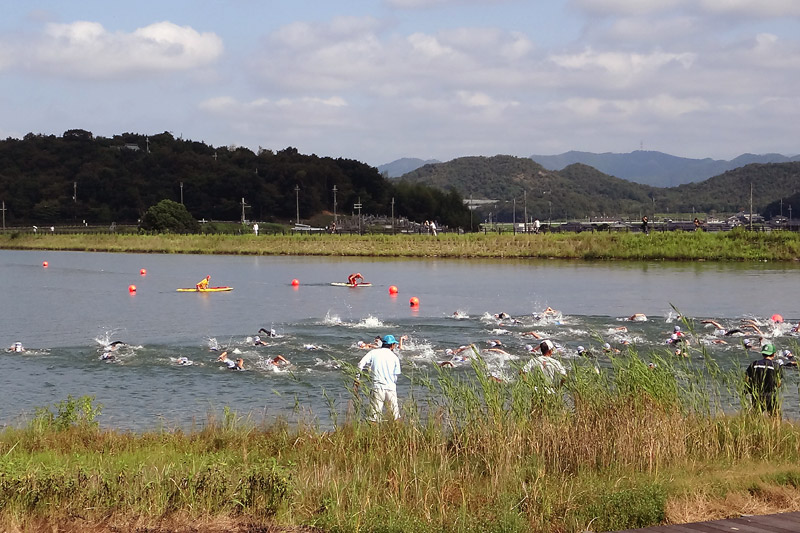 今回は、海のない加西市で、めずらしいため池を使ったトライアスロン大会でした。