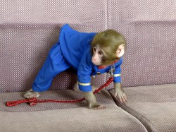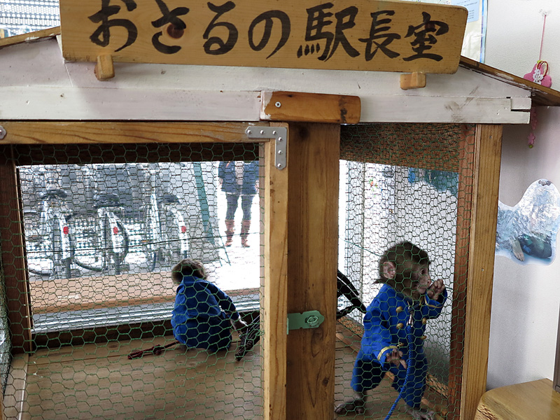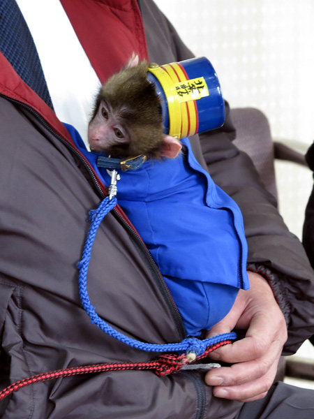 鉄道の人に抱かれ、小ざる駅長も一緒に乗車