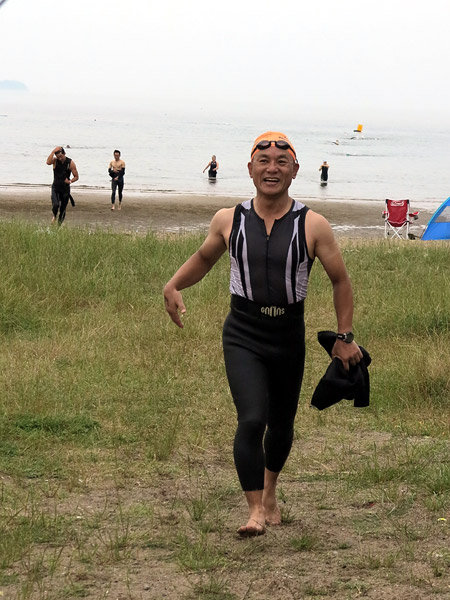 スイム会場で、ウェットスーツを着て、いよいよスイム1.5kmです。