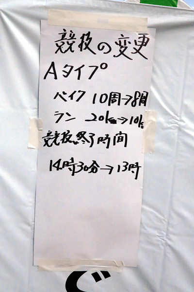 テントには、台風のため、距離を短縮する案内が。