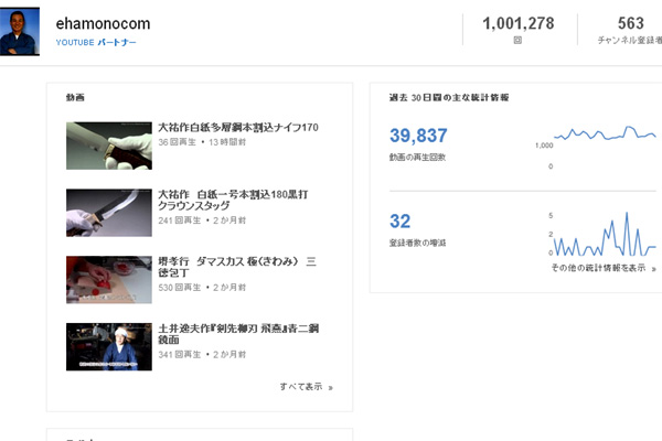 YouTubeの『e刃物comチャンネル』で、総再生回数が、