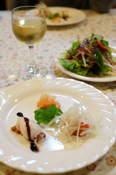 夕食は、洋食のコース料理、まずサラダと前菜のシーフード、イカと、サーモンと、