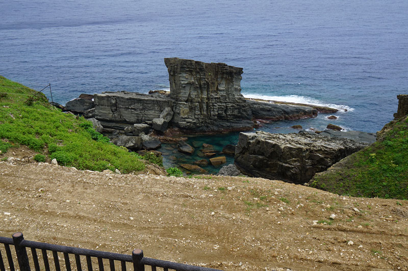 断崖絶壁が続く海岸の少し沖に立つ岩礁で、古来より「神の岩」と呼ばれ、