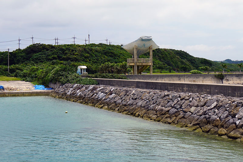 島の西橋にある、細崎(くばざき)海岸の漁港と、海人公園。