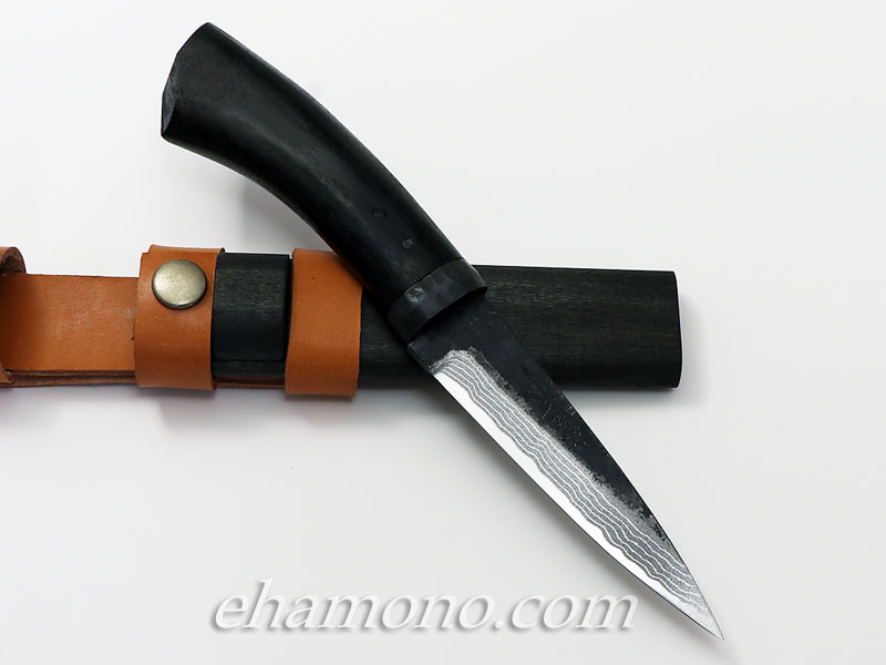 先端が尖った切れ味鋭い刀身は、白紙多層鋼を使用、素朴な黒打ち仕上げが