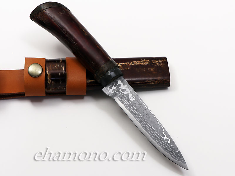 多層鋼の美しい刀身に、柄と鞘に桜の皮を巻いた優美な作りが魅力的なナイフ。
