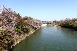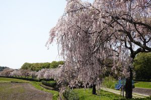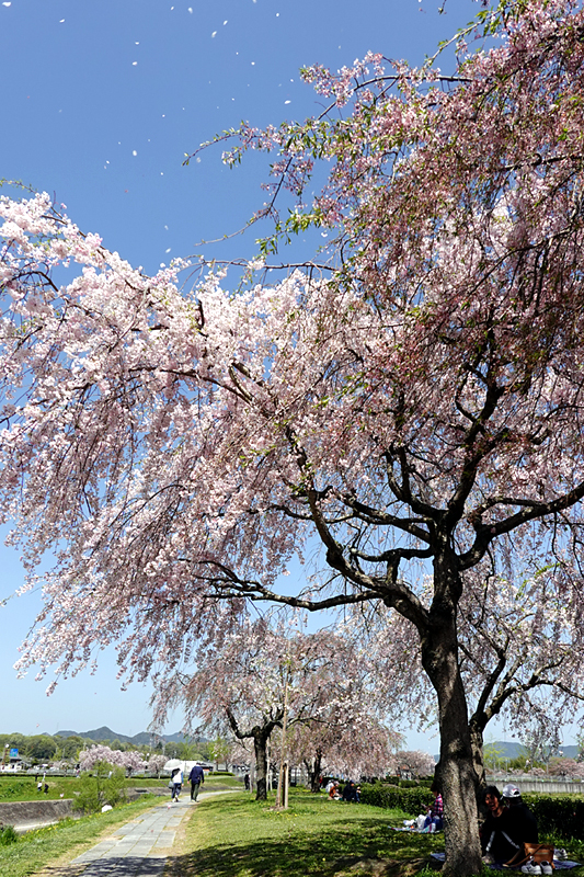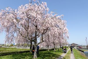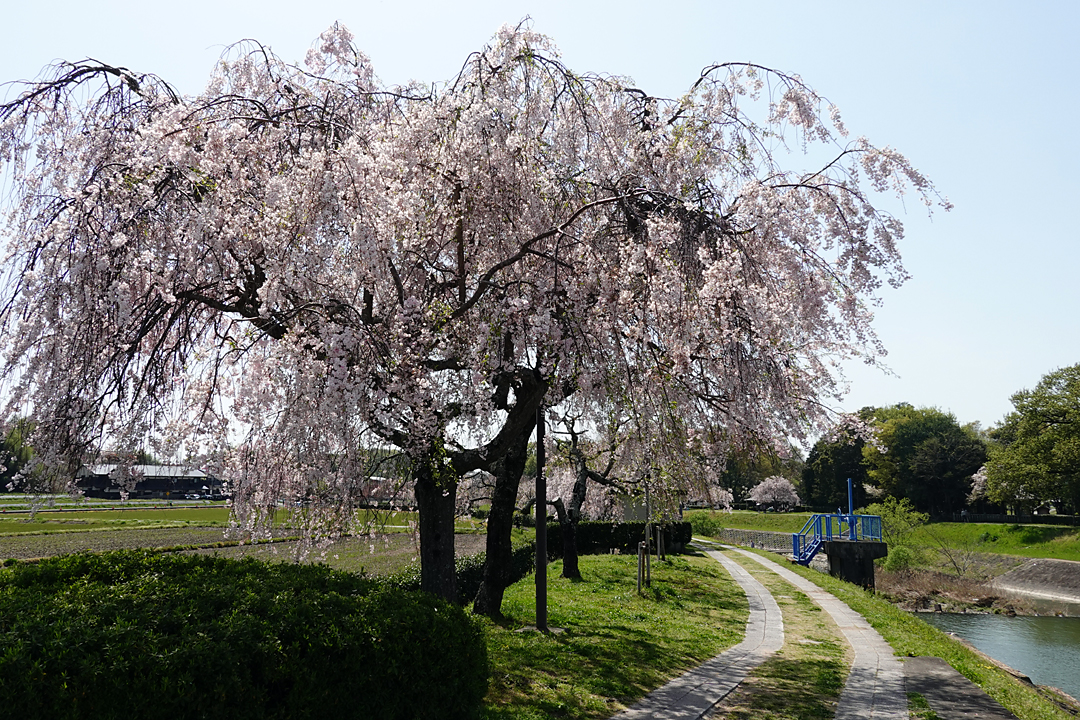 河川沿いに枝垂れ桜と、上の方にはソメイヨシノでしょうか。