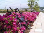 道にはツツジが満開目を楽しませてくれます。 後ろは越えてきた山です。