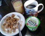 シリアルは、ケロッグ 「オールブラン」と「玄米フレーク」 そして、筋肉を柔らかくするというグレープフルーツジュースと、ヨーグルト、コーヒー。 昼前にはかなりお腹がすきますが、これで我慢です。 シリアルは、食物繊維がたっぷりで、おかげで毎日快便です(^_^; 高いお金払って、変なダイエット薬買って飲むより、確実にいいんじゃないかと思います。