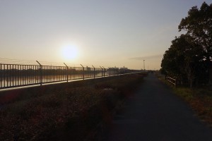 すっかり上がりきった初日を見ながらいつものコースをジョグ。